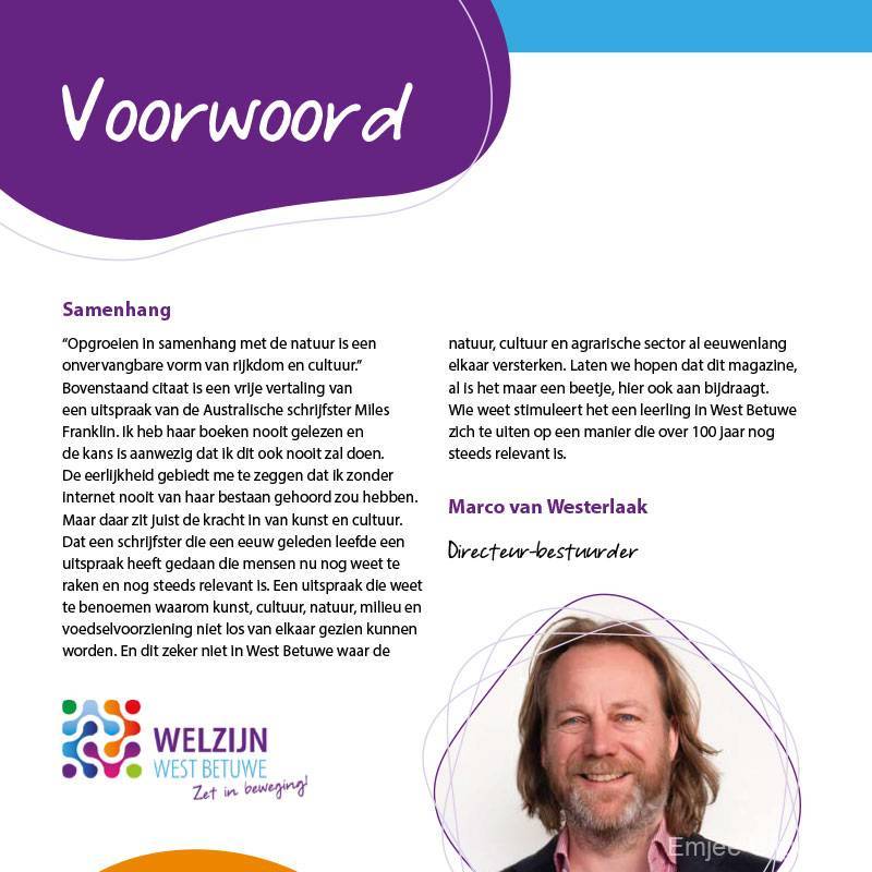 In dit magazine wil Welzijn West Betuwe kunst- en cultuurmakers uit West Betuwe een podium bieden.